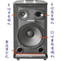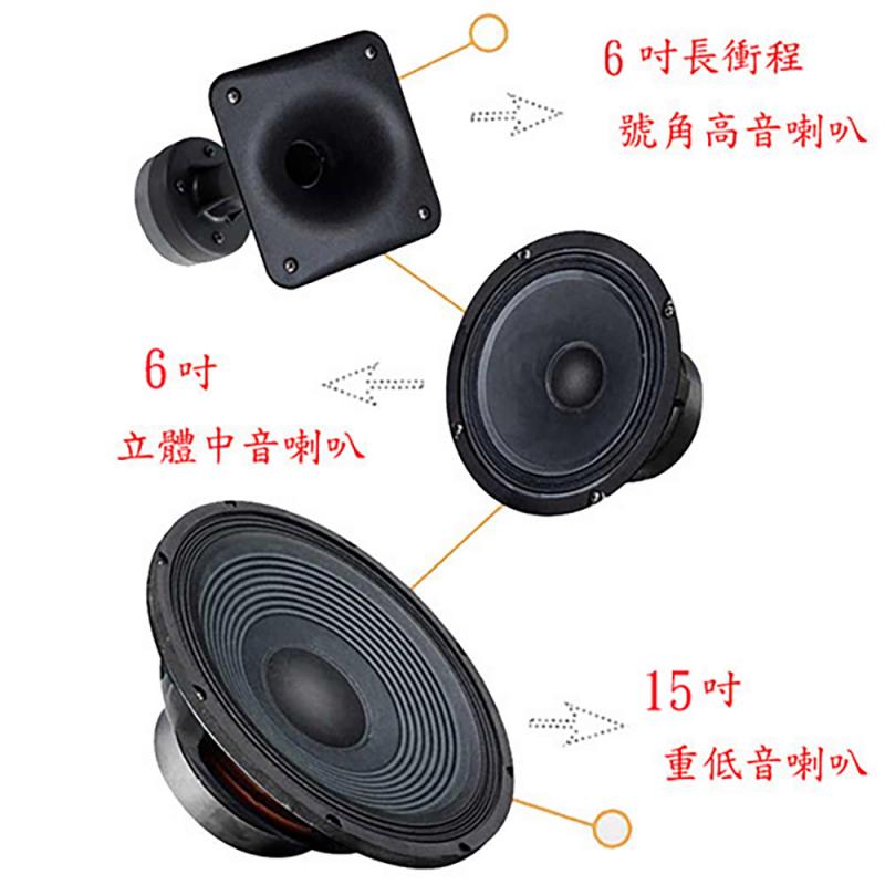 喇叭規格 : 15吋高功率重低音喇叭+6吋立體中音喇叭+6吋號角高音喇叭