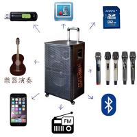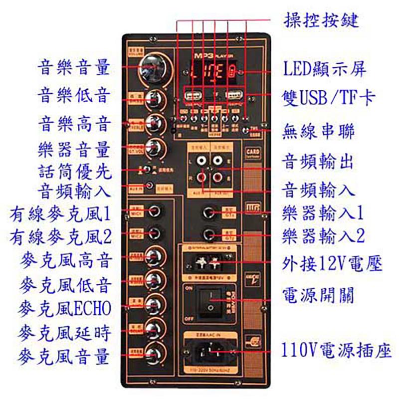 支援卡拉OK歡唱、藍牙、隨身碟、TF卡、FM、AUX輸出/輸入、錄音。