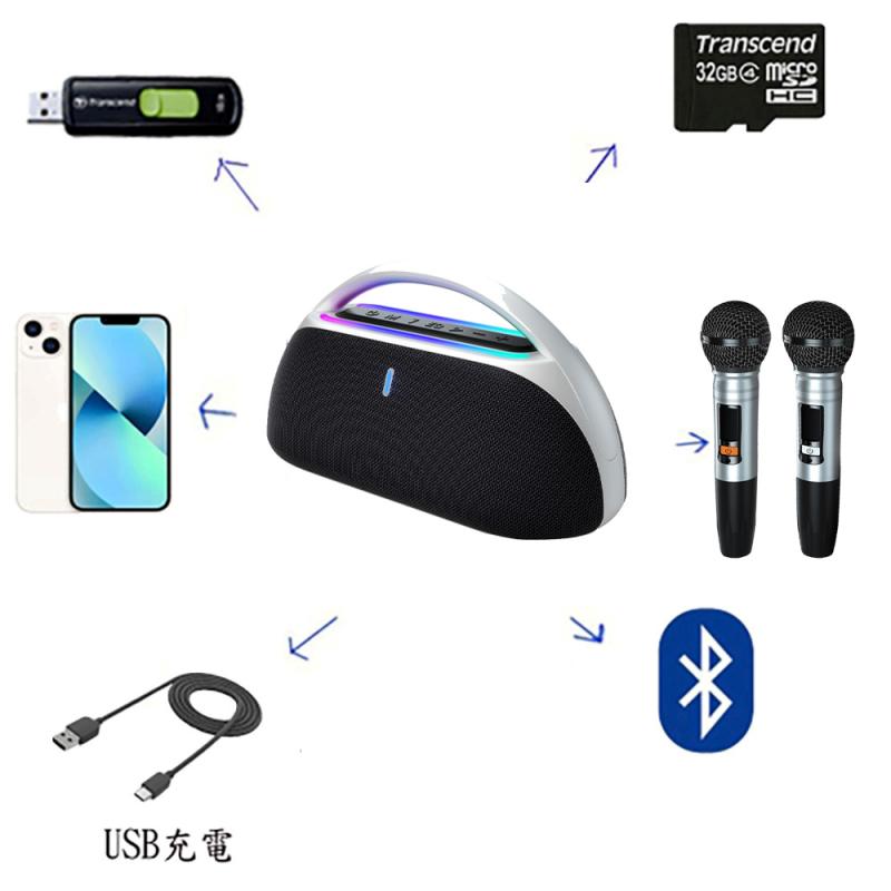 支援藍牙、隨身碟、TF卡、AUX輸入、可外接手機、平板、MP3 Player…等。