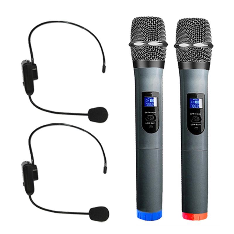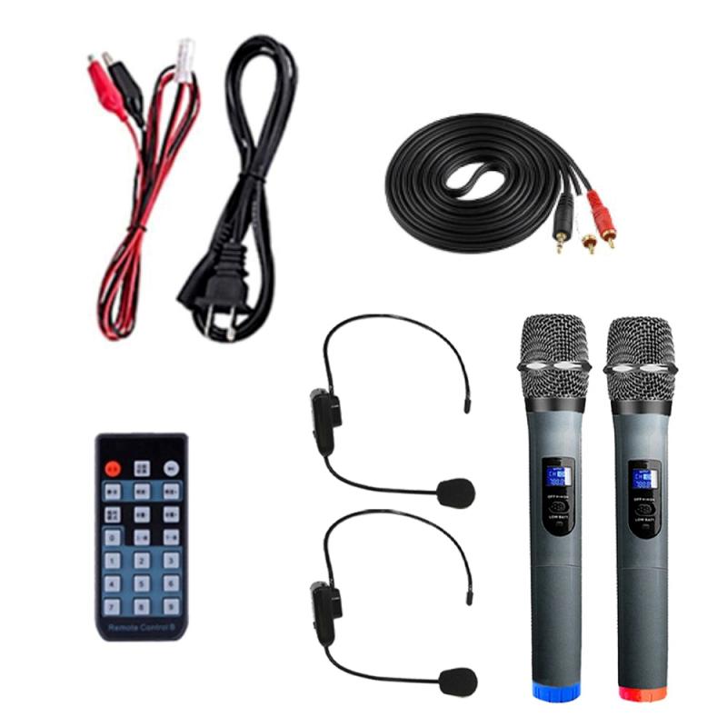 4. 附贈內建型無線式UHF液晶屏手持麥克風X 2、及外置式無線液晶屏耳掛麥克風X 2 (附接收器組),共四支無線麥克風,可同時使用。最多可使用七組麥克風(無線+有線)。