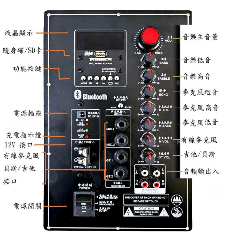 5. 支援卡拉OK歡唱,可調整主音/高音/低音/ECHO混音。配有吉他及貝斯等樂器專用輸入孔座,可做樂器演奏及演唱使用。